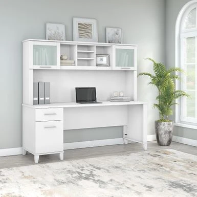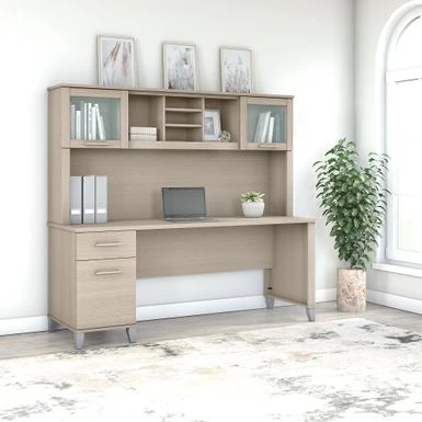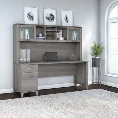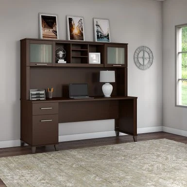 A spacious work surface and plenty of storage capacity make the 72-inch Office Desk with Hutch a perfect choice for your home office. A spacious work surface and plenty of storage capacity make the 72-inch Office Desk with Hutch a perfect choice for your home office. Spread out with a computer and paperwork while multitasking on an expansive desktop that includes a convenient wire management grommet to keep cords and cables in order. The desk’s file drawer opens on smooth full-extension ball bearing slides for easy access to legal and letter size documents, while a box drawer keeps the office supplies and utensils you need close by. Drawers can be mounted to either side of the desk for a custom configuration. The Hutch attaches to the desktop and adds a pair of lift-up frosted glass doors for concealed storage in addition to open cubby spaces with 2 adjustable shelves for books, binders, decorations and more. Somerset’s transitional styling includes your choice of attractive Mocha Cherry, Hansen Cherry, Maple Cross and Ash grey finishes with tapered leg accents and contemporary metal hardware for an appealing look that works with virtually any decor. The 72-inch x 24D computer desk can also be used with the coordinating 42-inch 3 Position Sit to Stand Return (sold separately) to create an ergonomic height adjustable workspace. The Office Desk with Drawers and Hutch set is tested to meet ANSI/SOHO quality standards for safety and performance and is backed by a 6 Year Manufacturer’s Warranty. See the full collection of home furnishings to expand your workspace.
