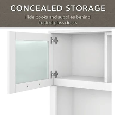 - Hutch attaches to the desktop and features 2 lift-up frosted glass doors for concealed storage