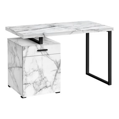 - Computer desk with 1 drawer, 1 large storage compartment, and a thick-panel floating desktop in a modern white marble-look laminate