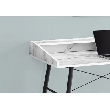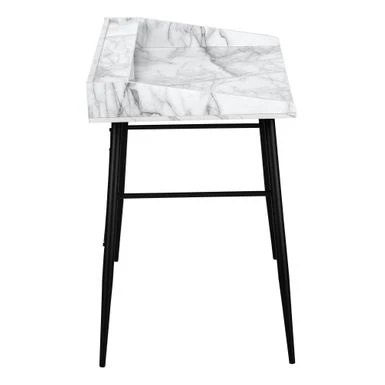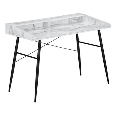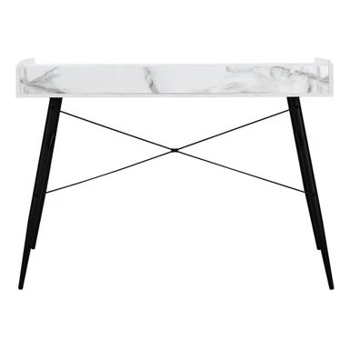 This computer desk with hutch in a white marble-look finish will take your home office to the next level. The sides of the desktop gradually rise to meet the hutch for a sleek look. The top of the hutch doubles as a shelf, while the space underneath is divided into 2 storage cubbies where you can tuck away small items and keep your work surface organized. Providing support and stability is a metal base in a black finish and featuring striking design details, like tapered metal legs and slender X-shaped support bars. This laptop or writing table has a compact design and mid-century modern style that is a great choice if you use your living room or bedroom as a home office.