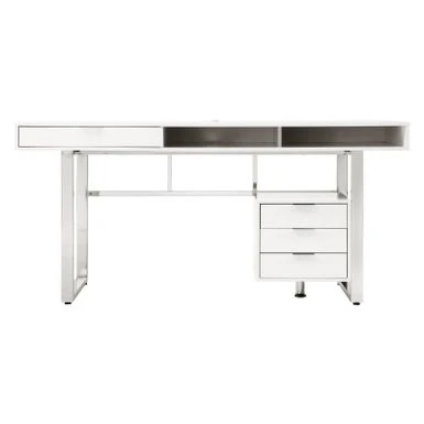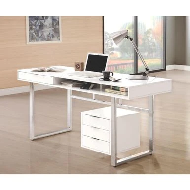 Whether you work at home a lot or just want a stylish accent piece, this computer writing desk offers modern function and style. Whether you work at home a lot or just want a stylish accent piece, this computer writing desk offers modern function and style. The desk boasts a glossy white top with a chrome metal frame. The desk features open storage compartment and four drawers, perfect for keeping your office sneat and clean of clutter while holding supplies right within reach. The distinct clean lines lend modern appeal that adds a timeless elegant look to any space.
