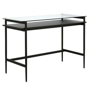 Work from home in mid-century style with this modern desk. The sleek lines of its steel frame are offset by a sturdy tempered glass top, allowing you a clear view to the woodgrained shelf below. Its open lower space provides plenty of room to settle in and take on the day. Go contemporary in blackened bronze or glam in golden brass to elevate your home office, game room, or vanity area.Â