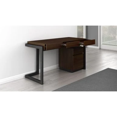 Functional as it is visually glamorous model FT56CWD writing desk features clean contemporary lines and a dramatic display of beautiful natural American walnut veneers and solid Brazilian cherry wood leg elements in an ebony finish. It has three full extension drawers and a generous writing surface. Some easy assembly is required.