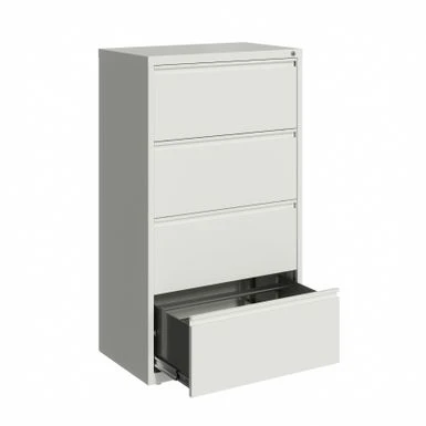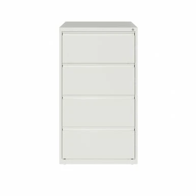 This 30 in. wide 4 drawer commercial grade lateral filing cabinet is designed for heavy duty use, yet looks great in any office. Precision ball-bearing suspension allows for quiet use in your busy office environment. This 30 in. wide 4 drawer commercial grade lateral filing cabinet is designed for heavy duty use, yet looks great in any office. Precision ball-bearing suspension allows for quiet use in your busy office environment. Fully assembled steel construction with reinforced base. Non-porous surface is easy to clean. Interlock system prevents tipping by only allowing one drawer open at a time. Dual lock bars and core-removable lock come standard. Unit includes hang rails, magnetic label holders, and four adjustable leveling glides. Greenguard Gold certified for indoor air quality. Meets or exceeds ANSI/BIFMA standards. TAA compliant. Limited Lifetime Warranty.