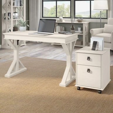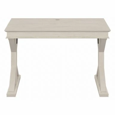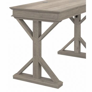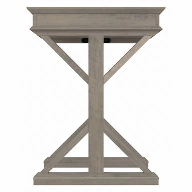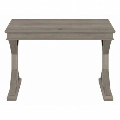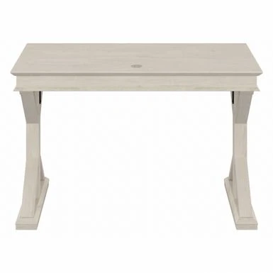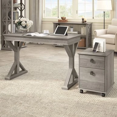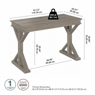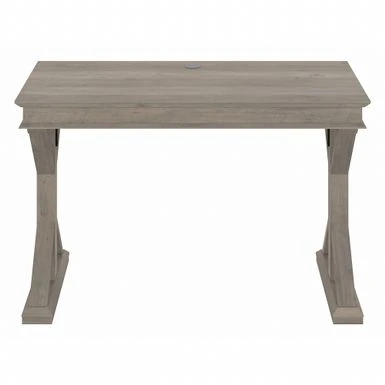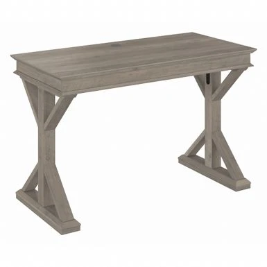 The Bush Furniture Homestead Farmhouse 48W Writing Desk blends a durable work surface with an appealing look to offer a stylish, long-lasting solution for the modern professional. The Bush Furniture Homestead Farmhouse 48W Writing Desk blends a durable work surface with an appealing look to offer a stylish, long-lasting solution for the modern professional. Rely on this sturdy workstation to tackle your next project or assignment with a computer, books, paperwork, and more on a desktop that supports up to 200 pounds. A built-in wire management grommet keeps cords and cables in order, so your work area remains free from clutter. The compact 48W x 23D design presents an ideal computer desk for small spaces and is designed to look great facing any direction in your home office. Thoughtfully designed for maximum stability and includes hardware to anchor the office desk to a wall. The Writing Desk’s 30H height dimension matches Homestead’s Farmhouse Lateral File Cabinet to create an extended work area when placed side by side, and the coordinating Mobile File Cabinet fits conveniently underneath the desktop for easy access to paperwork and supplies. The Computer Desk’s trestle leg design and chamfered profile edges give this modern desk a casual farmhouse style. Finishes with a beautiful natural grain pattern create a relaxed feel in your home or office. This Modern Desk has been meticulously tested to meet or exceed ANSI/SOHO quality standards for safety, durability and performance and is backed by the Bush Furniture 1 Year Manufacturer’s Warranty. See the full collection for coordinating items available.