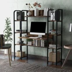 Industrial elements shine in this mixed-material desk. Double X-cross leg supports in sand black support a smooth, pale gray wooden table top. There’s plenty of room for storage as three drawers are featured on the front, while an integrated USB and power outlet keep your computer powered up.
