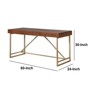 Introducing a stylish and functional writing desk that will elevate the look of your workspace. This desk is designed with a walnut brown finished top that perfectly complements the unique metal legs finished in metallic gold. The desk boasts a smooth top that can be used to showcase your favorite decor items or for writing and working. It also features three spacious drawers to keep your office supplies organized and your work area clutter-free. This versatile piece can be used as an accent table in your entryway or as a writing desk in your home office. Upgrade your decor with this classic and elegant addition.