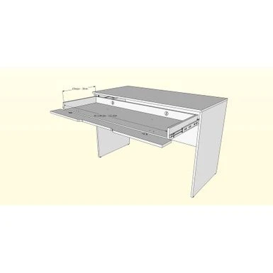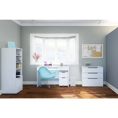 Arobas Desk with Storage Tray from Nexera is a multi-functional desk. It features a pull-out tray with a drop-down door and divisions. Arobas Desk with Storage Tray from Nexera is a multi-functional desk. It features a pull-out tray with a drop-down door and divisions. Use the front section either for your keyboard and mouse or as a storage space and the back section to keep small devices and office supply organized. The storage tray is equipped with full extension slides so you have access to its content all the way to the back and features 4 wire management grommets so you can easily charge your many devices without desperately searching for your cables. Arobas Collection from Nexera is characterized by its unique modern design, multiple smart features and offers flexible settings for your entertainment and home office areas. Storage tray with drop-down door and divisions, mounted on full extension slides 4 wire management grommets to keep your cables organized and accessible at all times Desk finished all around for flexibility and optimal use White melamine finish