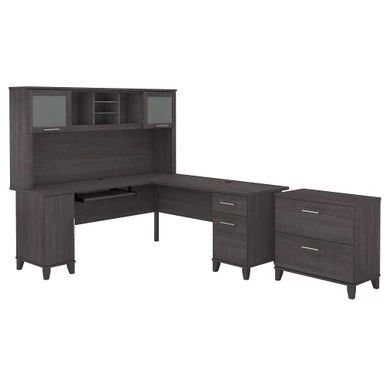 Build your ideal home office around the stylish and functional Bush Furniture Somerset 72W L Shaped Desk with Hutch and Lateral File Cabinet. This spacious office set features all the storage and versatility needed to create a practical, modern workstation. The expansive 72W surface with wire management offers ample room to spread out and complete large projects. A convenient pull-out shelf provides a perfect place to keep a keyboard or laptop, while a vertical storage cabinet with an adjustable shelf and a box drawer offer plenty of storage for office supplies and utensils and a file drawer accommodates letter-size documents. The Hutch has large open compartments for books, binders or decorations and two frosted glass doors for concealed storage. The Lateral File Cabinet utilizes smooth ball bearing slides for easy access to legal and letter size files, even those all the way in the back. Drawers are designed to open one at a time for maximum stability, making the filing cabinet a safe and family-friendly storage solution. Transitional styling includes your choice of several attractive finishes with tapered leg accents and contemporary metal hardware for an alluring appearance. This home office furniture set is tested to meet ANSI/SOHO quality standards for safety and performance and is backed by the Bush Furniture 6 Year Manufacturer’s Warranty.