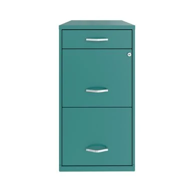 The Three Drawer Metal File Cabinet is the ideal storage solution for any small office or home office. Featuring two file drawers and an additional small storage drawer, this file cabinet is the perfect solution for your home office needs. This file cabinet features a smart, efficient design that works well in smaller spaces, and fits under most work surfaces or desks. Each drawer features high-sides to accommodate letter sized hanging files. The top pencil drawer can also be perfect storage for other office essentials. Using a patented glide suspension, the drawers have a smooth open and close slide with a three-quarter drawer extension. In addition, you can keep your files and possessions secure by using the built-in lock for both drawers. Painted steel surface is non-porous and easy to clean . Bring organization and function to your home or office with this three-drawer file cabinet!