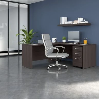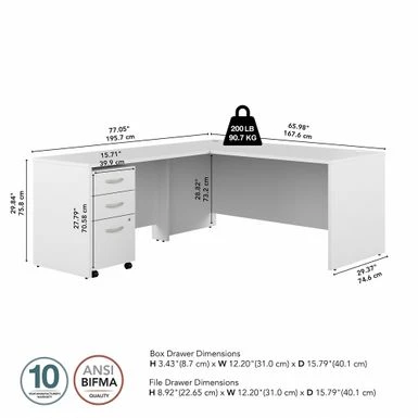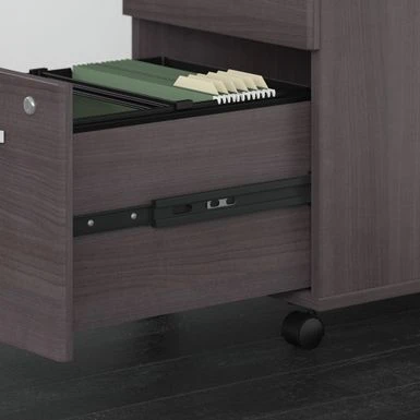 The Bush Business Furniture Studio C 66W x 30D Office Desk with 48W Return and 3 Drawer Mobile File Cabinet offers a stylish, long-lasting workspace solution for today’s professionals. The Bush Business Furniture Studio C 66W x 30D Office Desk with 48W Return and 3 Drawer Mobile File Cabinet offers a stylish, long-lasting workspace solution for today’s professionals. The 66W x 43D surface offers space to spread out and integrated cable management to conceal computer cords. The thermally fused laminate finish, durable edge banding and sturdy end panels resist scratches, stains and dents while standing up to the rigors of a 40-plus hour work week. The 36W Return attaches to either side of Studio C Desks (sold separately) to create L or U Shaped configurations with a right or left handed layout. The locking filing cabinet’s bottom drawer accepts letter, legal and A4-size paperwork while a pair of box drawers organize supplies. The two bottom drawers can be locked to protect sensitive files and personal items. Available in your choice of several contemporary and traditional finishes to fit any work environment. This commercial office desk with storage has been meticulously tested to meet or exceed ANSI/BIFMA standards for safety, durability and performance and is backed by a 10 Year Warranty.